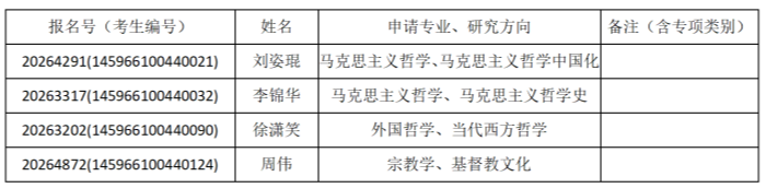 经过材料审查,并经哲学院研究生招生工作领导小组审核,哲学院2026年招收硕博连读研究生入围综合考核名单已确定,现予以公示。